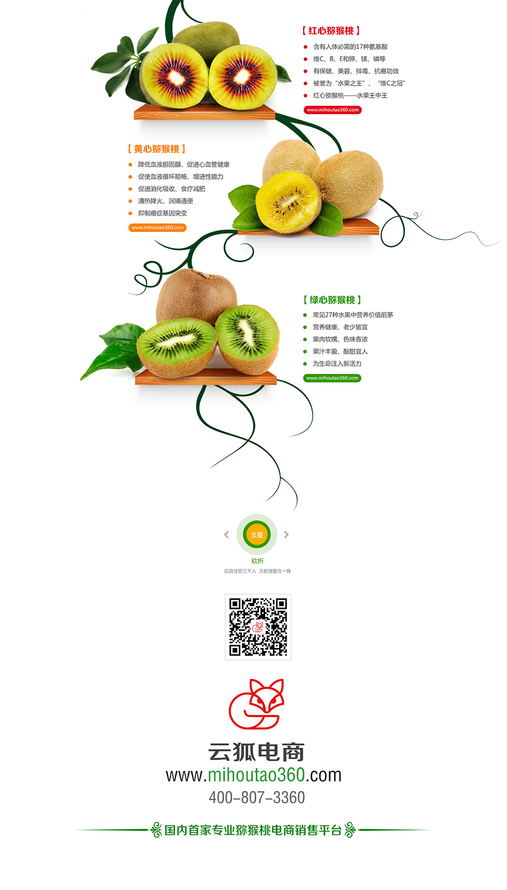懿旨到——小獼奉女皇之命通知大人:來(lái)自女皇故里的云狐獼猴桃(www.mihoutao360.com)電商平臺(tái)正式開(kāi)售了,本期主打紅心獼猴桃。紅心獼猴桃含有人體必需的17種氨基酸和維C、B、E和鉀、鎂、磷等,有保健、美容、排毒、抗癌功效。被譽(yù)為“水果之王”、“維C之冠” 紅心獼猴桃當(dāng)之無(wú)愧水果王中王。在這中秋佳節(jié)來(lái)臨之際,特備好禮,還望笑納。注冊(cè)就有好禮相送哦,消費(fèi)還有積分。推薦朋友就可獲得能提現(xiàn)的“獼幣”。物美價(jià)廉包裝精美,實(shí)乃居家送禮必備良品。親,還忍得住嗎?趕快去下單吧!