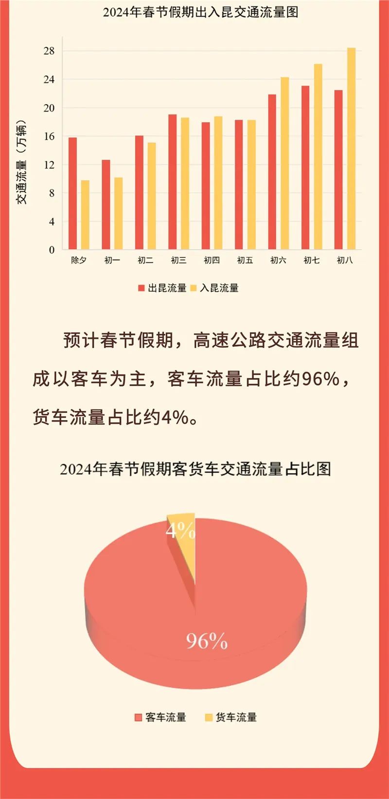 預(yù)計(jì)昆明西、小喜村、昆明北、杜家營(yíng)、昆明南、昆明西北、花紅園、周家村等主要出、入昆收費(fèi)站交通流量明顯增長(zhǎng),出昆流量在除夕、初一、初二領(lǐng)先入昆流量,入昆流量從初四開(kāi)始逐漸反超出昆流量,并在初八達(dá)到峰值。